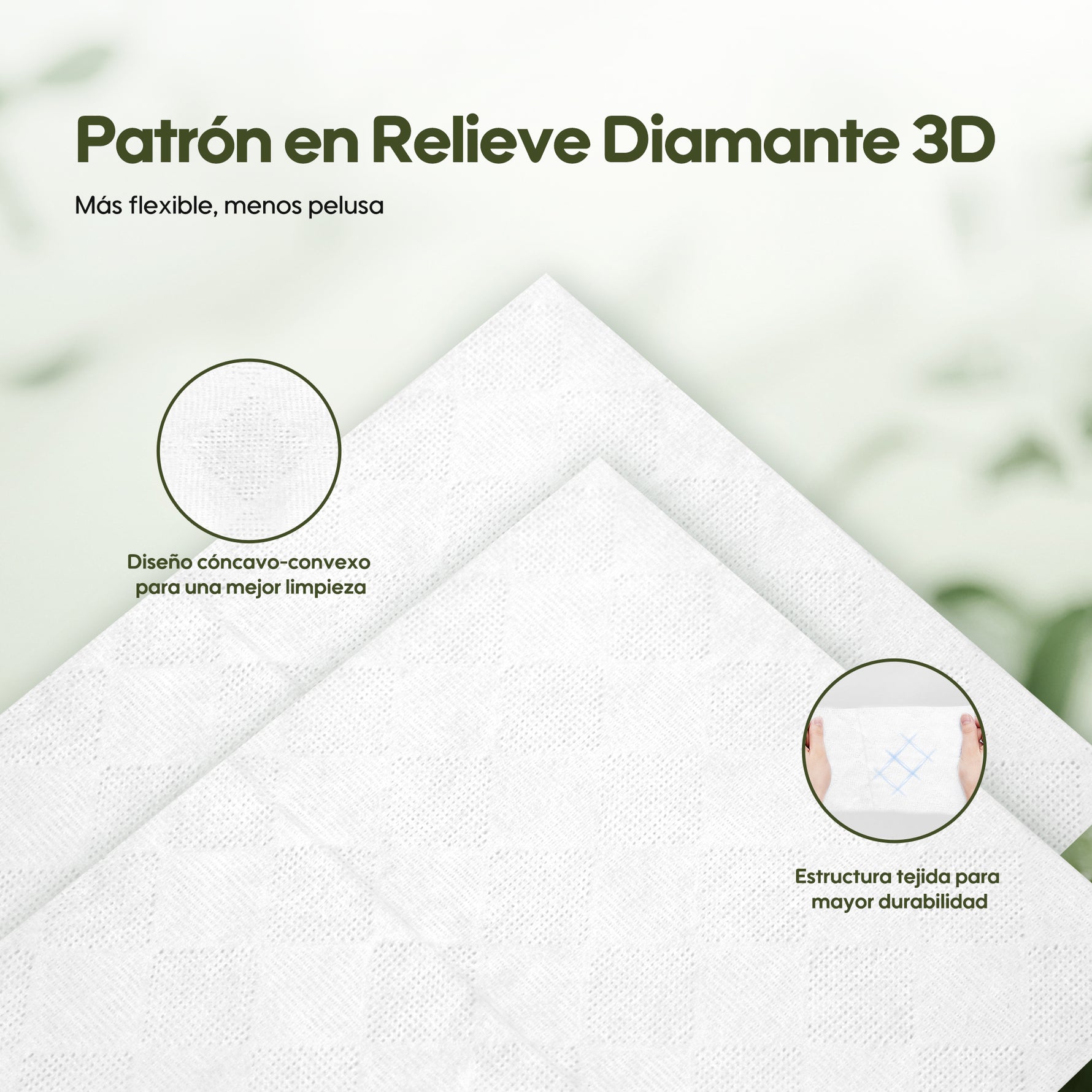Las toallitas secas cuentan con un diseño de patrón de diamante en relieve 3D. Esto no solo aumenta su durabilidad, sino que también previene eficazmente la formación de pelusa. El diseño cóncavo-convexo mejora el efecto de limpieza, eliminando mejor la suciedad. Además, su resistente estructura tejida reduce la probabilidad de deformación y aumenta su durabilidad.