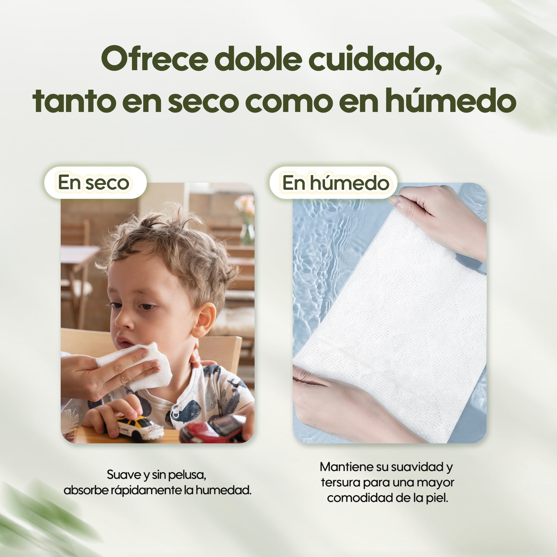 Cuentan con un diseño de doble uso, apto tanto en seco como en húmedo: suaves y altamente absorbentes en seco, y con mayor poder de limpieza cuando se utilizan húmedas. Limpian de manera delicada y eficaz, especialmente en las zonas más sensibles, garantizando comodidad y seguridad en cada uso.