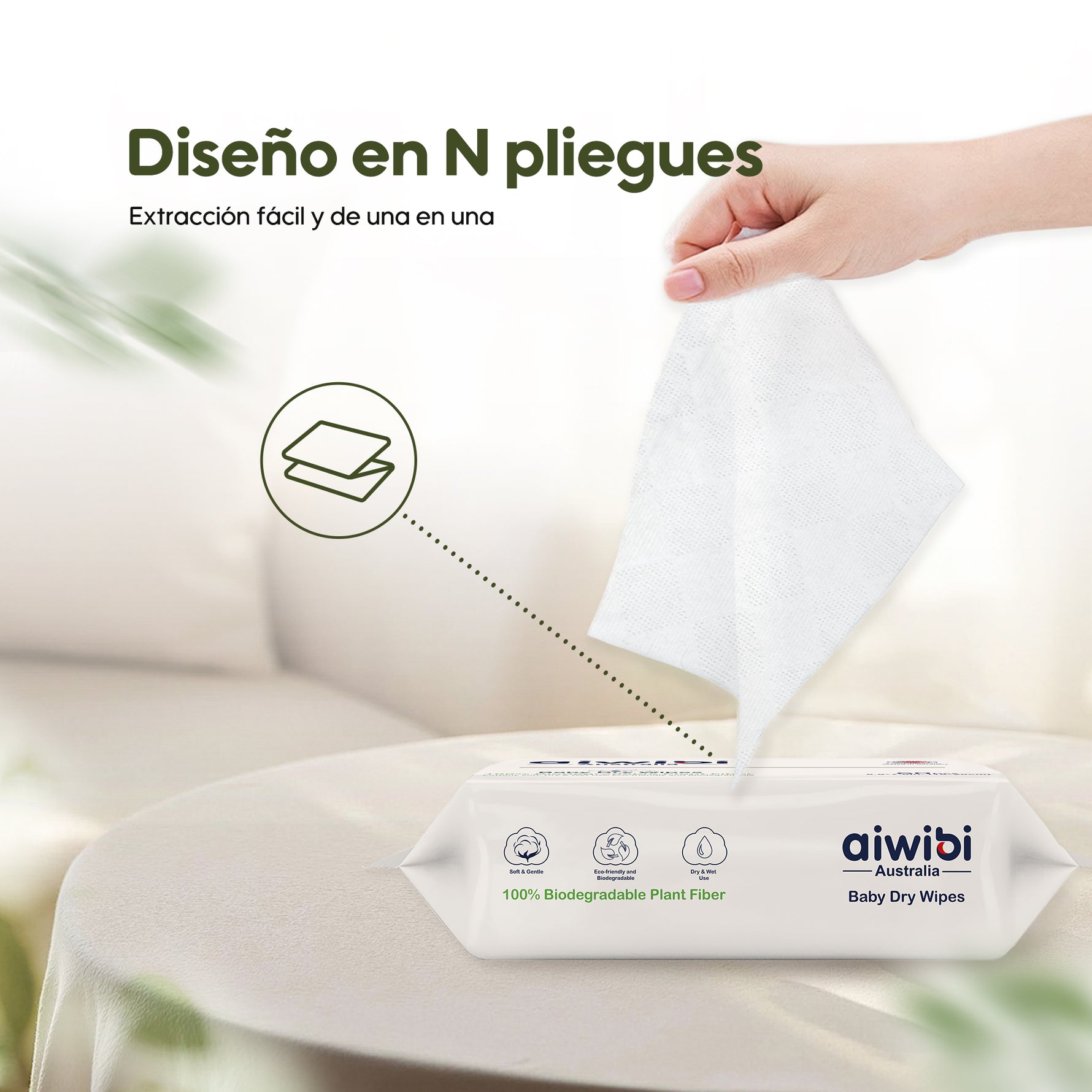 Las Toallitas Secas para Bebé Aiwibi están elaboradas con fibras vegetales 100 % biodegradables, ofreciendo un cuidado suave y seguro para la piel sensible de los bebés. Su exclusivo diseño 3D en forma de diamante mejora la eficacia de la limpieza, evitando la formación de pelusa y reduciendo la fricción con la piel.
