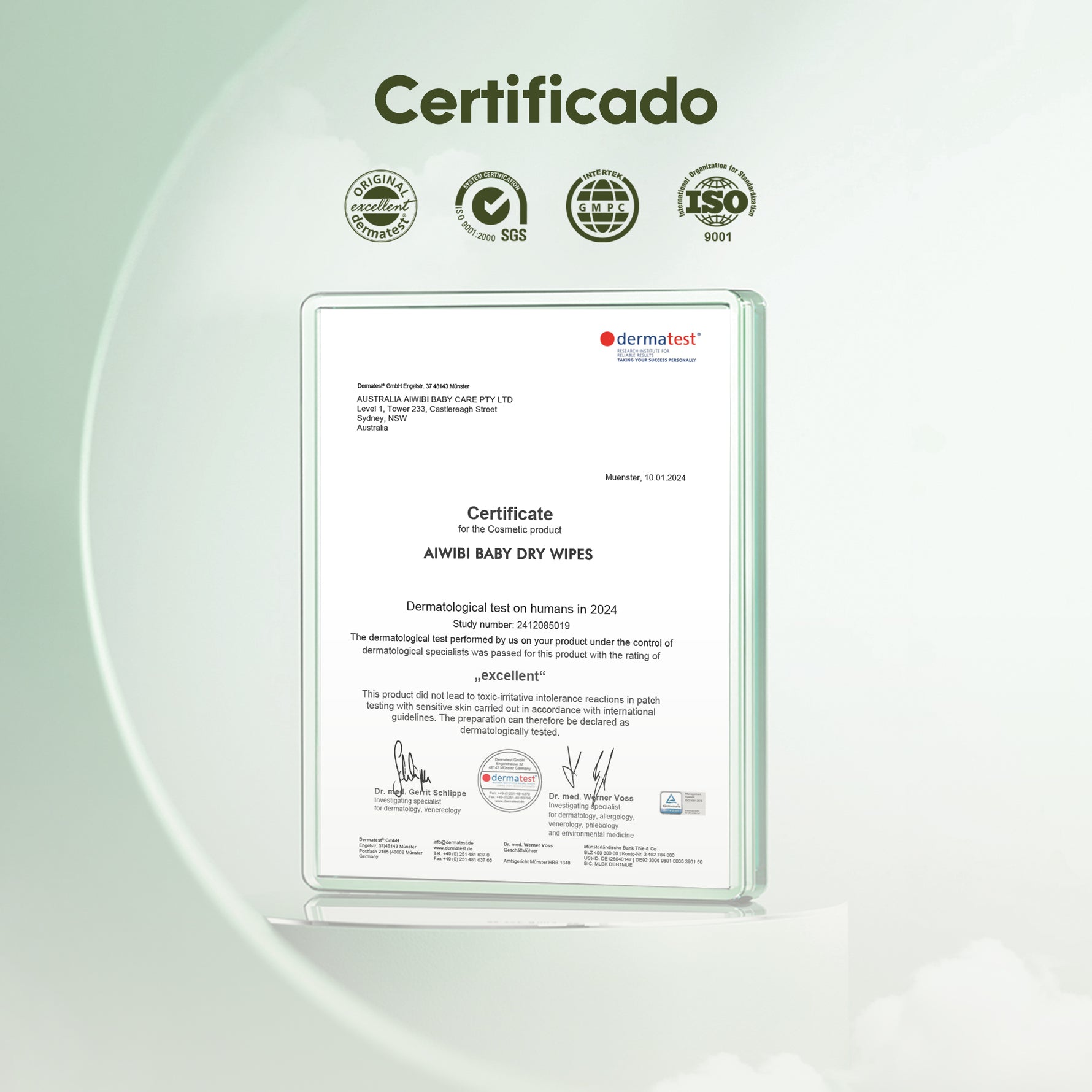 Las toallitas secas Aiwibi Baby cuentan con la certificación de dermatólogos alemanes. Son suaves, no irritantes y han superado pruebas de alergia. Son especialmente adecuadas para bebés con piel sensible.