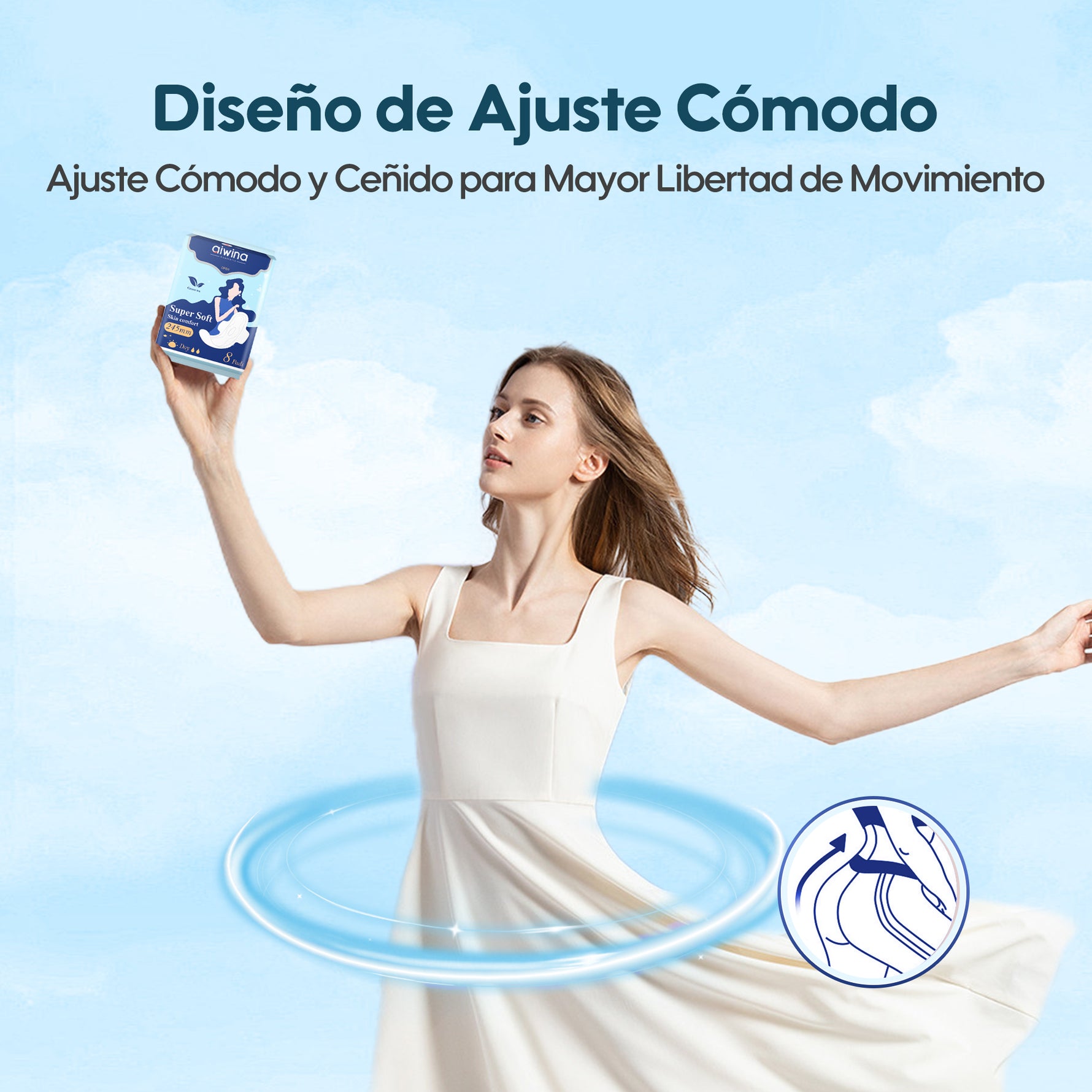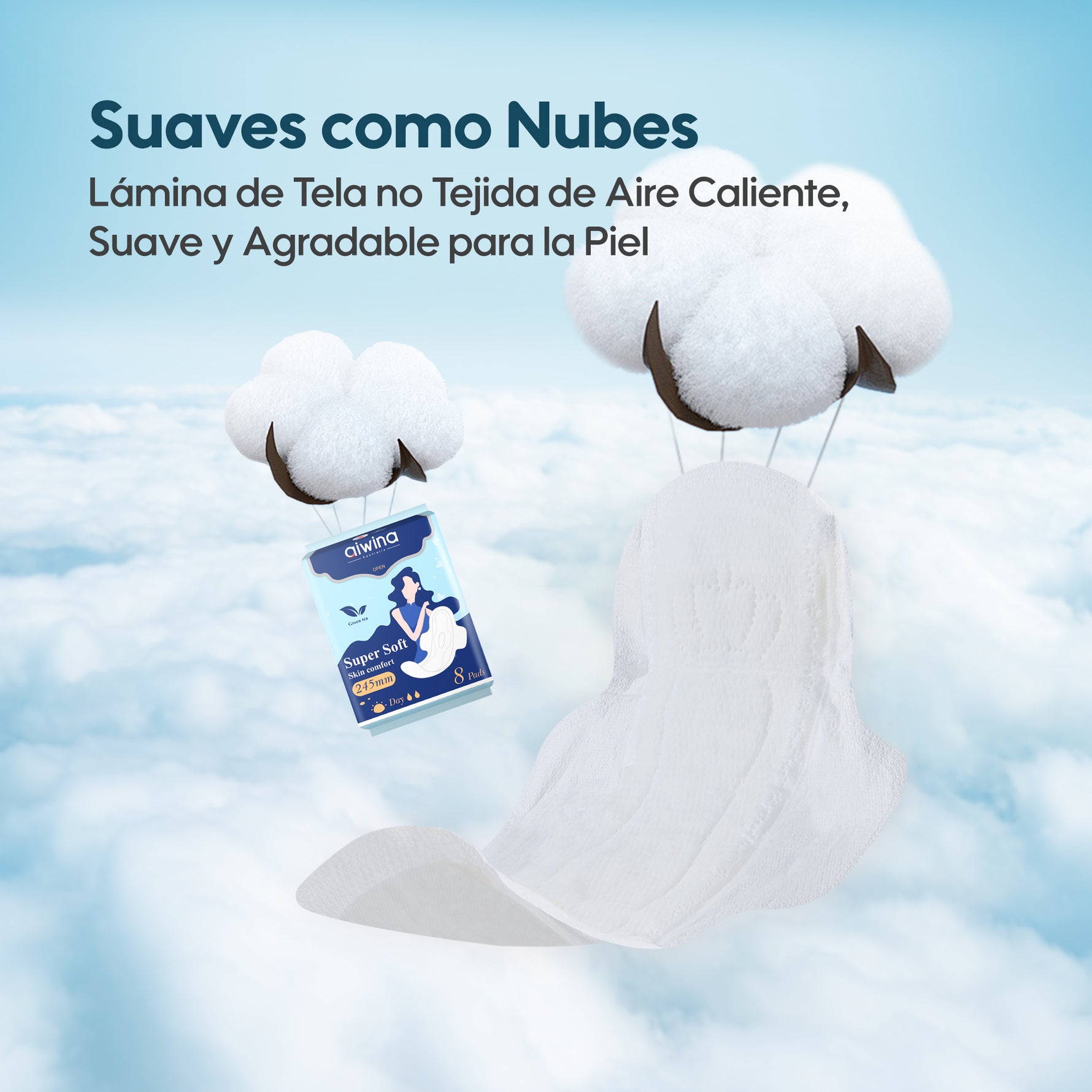 Precio unitario porToalla Sanitaria Súper Suave 245 mm de Aiwina están diseñadas para ser súper suaves, perfecta para uso diaria. Su diseño transpirable, con orificios de ventilación, ayuda a reducir la sensación de calor y adherencia.