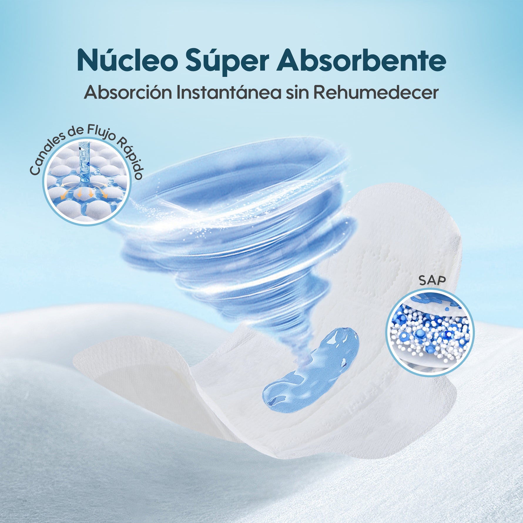Su Núcleo Súper Absorbente aleja la humedad de la piel, permitiendo una absorción más rápida y efectiva. Además, cada toalla cuenta con surcos direccionales que canalizan el líquido hacia el centro, garantizando una protección antifiltraciones confiable.
